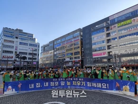 이날 참여자들은 상가와 학원 등에서 눈에 잘 띄는 곳에 부착한 뒤 실천을 되새길 수 있도록 ‘내 집·내 점포 앞 눈 치우기에 동참하겠습니다’라고 적힌 홍보 엽서를 배부했다.