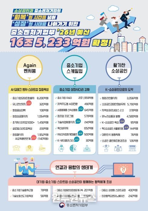 중기부는 ’26년 예산을 통해 소상공인의 회복과 자생력 강화에 집중하는 한편, 우리 경제의 미래 성장 동력인 중소·벤처·스타트업의 글로벌 도약 지원과 혁신 성장을 뒷받침할 예정이다.