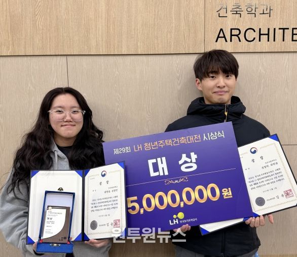 (원투원뉴스) 경상국립대학교(GNU·총장 권진회) 공과대학 건축학과 최한솔·성창민 학생이 12월 2일 한국토지주택공사(LH) 진주 본사에서 열린 ‘2025년 제29회 LH 청년주택건축대전’ 시상식에서 설계 부문 대상을 수상했다.