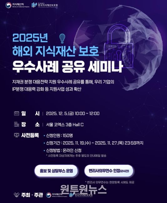 (원투원뉴스) 지식재산처는 12월 5일 10시 코엑스(서울시 강남구)에서 ‘2025년 해외 지식재산 보호 우수사례 공유 세미나’를 개최한다. 이번 행사는 2025 대한민국 지식재산대전의 일부 행사로 진행되며, 우리 기업이 해외 시장에서 자주 마주하는 지식재산 분쟁에 효과적으로 대응할 수 있게 실제 우수 사례와 대응 전략을 공유하는 자리로 마련됐다.