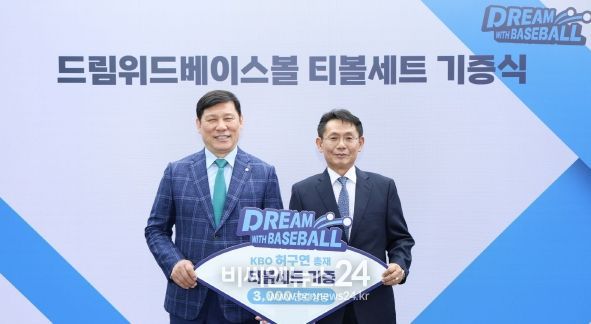 허구연 총재는 13일(수) KBO 스튜디오에서 열린 ‘드림위드 베이스볼 티볼세트 기증식’을 통해 한국티볼연맹에 3000만원 상당의 티볼 용품을 기부했다.