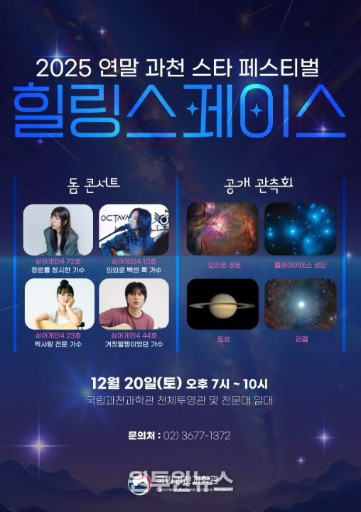 (원투원뉴스) 과학기술정보통신부 국립과천과학관은 연말을 맞아 12월 20일에 천체투영관과 천문대 일대에서 '과천 스타 페스티벌'을 개최한다고 밝혔다. 이번 행사는 돔 콘서트와 공개 관측회를 통해 관람객들이 과학관에서 TV 속 스타와 밤하늘의 스타를 동시에 만날 수 있는 기회를 제공하며, 과학과 예술이 어우러진 힐링의 시간을 선사할 예정이다.