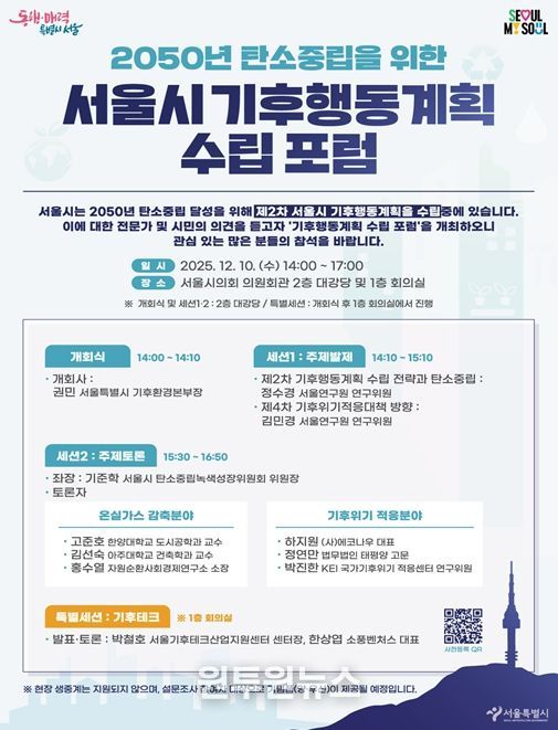 (원투원뉴스) 서울시는 12월 10일 서울시의회 의원회관에서 '2050 서울시 기후행동계획 수립 포럼'을 개최했다. 이번 포럼에는 건물·교통·폐기물·기후위기 적응 분야 전문가와 시민, 기업 등 100여 명이 참석해 2050 탄소중립을 향한 서울의 향후 전략을 함께 논의했다.