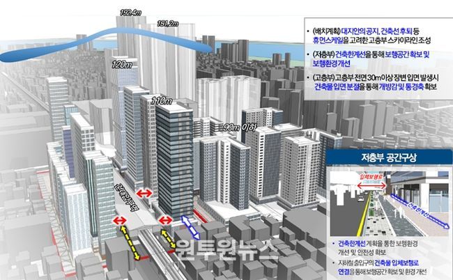 이와 함께 아차산로변의 복합용도 도입을 위해 최고높이를 20m 완화(100m→120m) 했고, 최대개발규모, 필지분할선, 획지계획을 전면 폐지하여 보다 자율적으로 개발을 추진할 수 있는 기반을 마련했다.