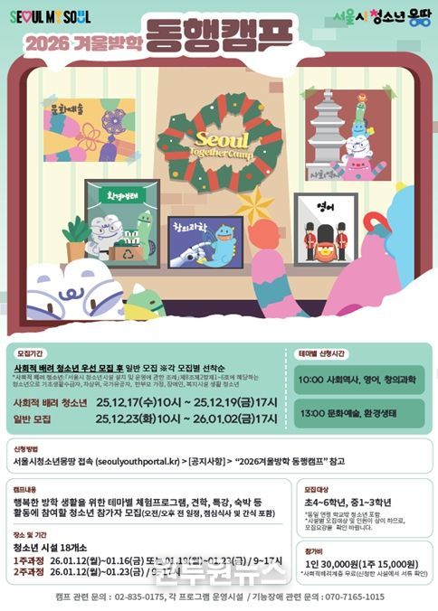 (원투원뉴스) 서울시가 다가오는 겨울방학을 맞아 청소년들의 돌봄 공백을 해소하고 진로 탐색의 기회를 제공하는 ‘서울시 청소년 동행캠프’를 추진한다고 밝혔다. 이번 캠프는 2026년 1월 12일부터 23일까지 2주간 서울시립청소년시설 24개소(청소년센터 21개소, 미래진로센터 2개소, 음악센터 1개소)에서 진행된다.