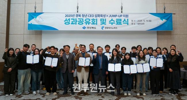 (원투원뉴스) 경상북도는 15일 경주 힐튼호텔에서 ‘2025년 경북 청년CEO심화육성 지원사업’ 및 ‘2025년 경북CEO JUMP-UP 지원사업’ 성과보고회 및 수료식을 개최했다.