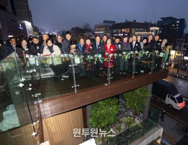 (원투원뉴스) 서울 용산구가 지난 16일 녹사평광장에서 ‘이태원 전망대 툇마루(덱) 정비공사’ 준공식을 열고 이태원 관광특구 활성화를 위한 새로운 관광명소의 탄생을 알렸다. 이태원 관광특구 시작점인 이태원 전망대 일대를 새롭게 정비하고, 벽천과 영상 예술(미디어아트)을 결합해 자연과 디지털이 어우러지게 마련한 점이 특징이다.