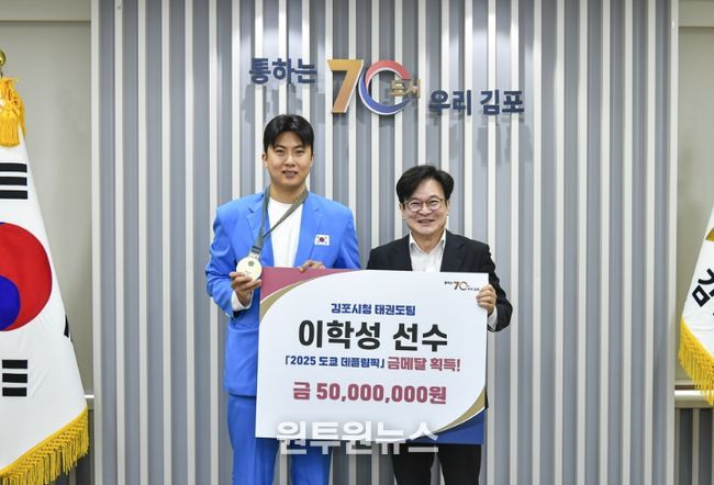 (원투원뉴스) 김포시는 17일 김포시청 소통실에서 2025 도쿄 데플림픽 태권도 +80kg급 금메달을 획득한 이학성 선수에게 포상금을 수여하며 그간의 노고를 격려했다. 이날 수여식에는 김병수 김포시장을 비롯해 교육문화국장, 체육과장, 지도자가 참석했으며 이학성 선수에게는 입상 포상금 5,000만원이 수여됐다.