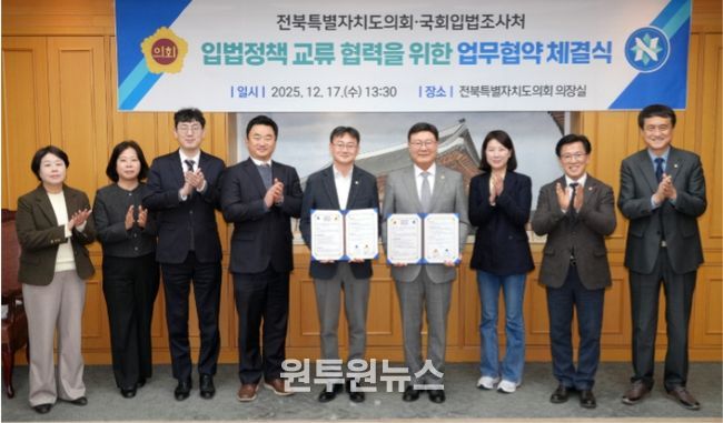 (원투원뉴스) 전북특별자치도의회는 17일 국회입법조사처와 입법정책 분야의 상호 교류 및 협력을 위한 업무협약(MOU)을 체결했다.