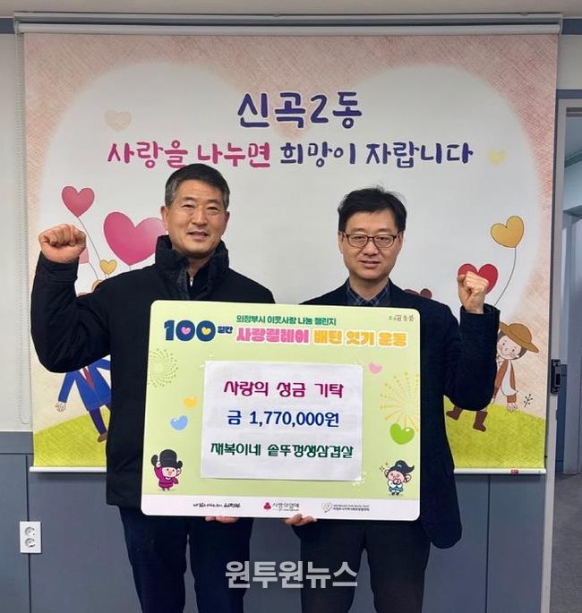 (원투원뉴스) 의정부시 신곡2동주민센터는 12월 18일 재복이네 솥뚜껑생삼겹살이 하루 매출액 177만 원을 기탁했다고 밝혔다.