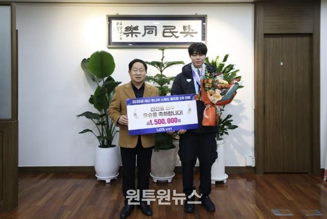 (원투원뉴스) 남양주시는 12월 18일 시장 집무실에서 2025년 ISU 주니어 스피드 월드컵 2차 대회에서 우승한 신선웅 선수에게 포상금을 전달하고 국제대회 입상 성과를 격려했다.