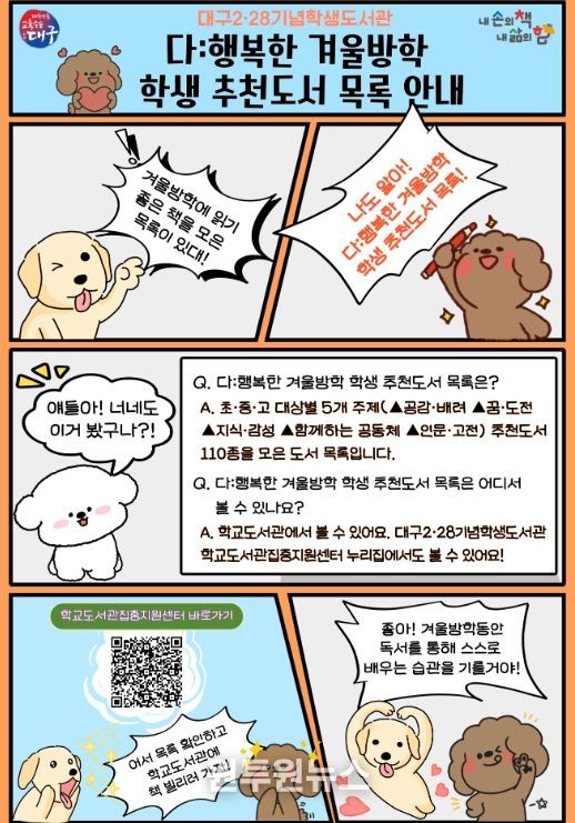 (원투원뉴스) 대구2·28기념학생도서관은 겨울방학을 맞아 학생들이 독서를 통해 정서적 성장과 사고력 신장을 도모할 수 있도록 학생 맞춤형 추천도서 목록인 ‘다:행복한 겨울방학 학생 추천도서 목록’을 배포한다.