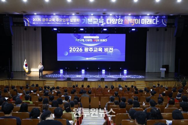 시교육청은 19일 광주광역시교육청교육연수원 대강당에서 학교장 및 주요 기관장 등 1천여 명이 참석한 가운데 ‘2026 광주교육 주요업무 계획 설명회’를 개최했다.
