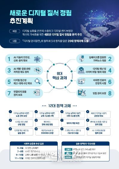 8대 핵심과제로는 전문가 자문과 관계부처 협의를 거쳐 ▲AI 기술의 안전성 및 신뢰·윤리 확보 ▲딥페이크를 활용한 가짜뉴스 대응 ▲AI 개발·활용 관련 저작권 제도 정비 ▲디지털 재난 및 사이버 위협·범죄 대응 ▲디지털 접근성 제고·대체 수단 확보 ▲비대면 진료의 안정적 시행 ▲연결되지 않을 권리 보호 ▲잊힐 권리 보장을 지정했다.