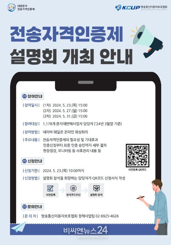 (비씨엔뉴스24) 방송통신위원회는 '대량문자전송사업자 전송자격인증제 자율운영 가이드라인'의 본격적인 시행(’24.6.1.)을 앞두고 전송자격인증제 사전 설명회를 개최한다고 밝혔다.