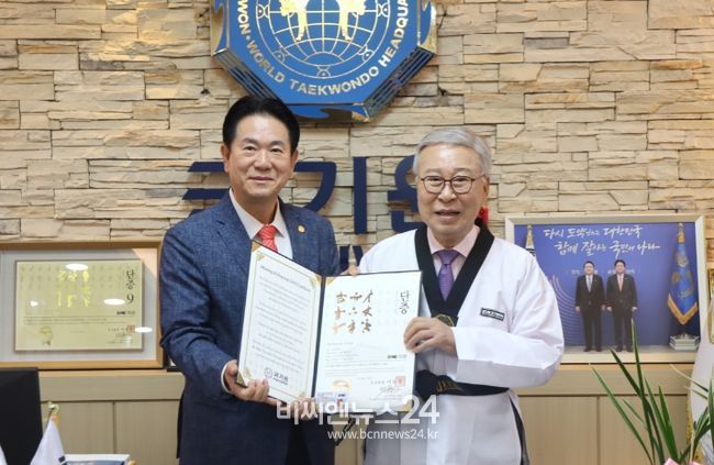 이어 이동섭 국기원장이 김창준 前 미국 연방하원의원 등 6명에게 명예 7단증을 수여하고 태권도복과 띠를 증정했다.
