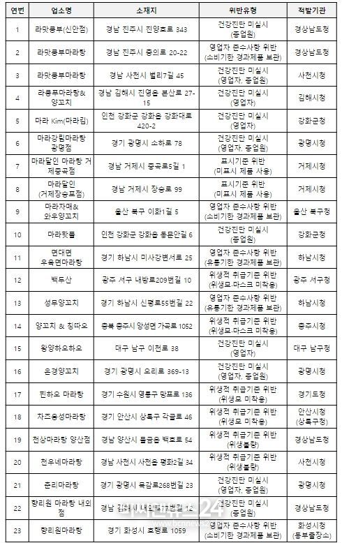 (비씨엔뉴스24) 식품의약품안전처는 마라탕, 양꼬치, 훠궈 등을 조리하여 배달하는 음식점과 커피를 조리‧판매하는 무인카페 총 4,056개소에 대해 2월 19일부터 23일까지 17개 지방자치단체와 함께 집중 점검을 실시한 결과, 「식품위생법」, 「식품 등의 표시‧광고에 관한 법률」 등을 위반한 23곳(0.6%)을 적발해 관할 지방자치단체에 행정처분을 요청했다고 밝혔다.