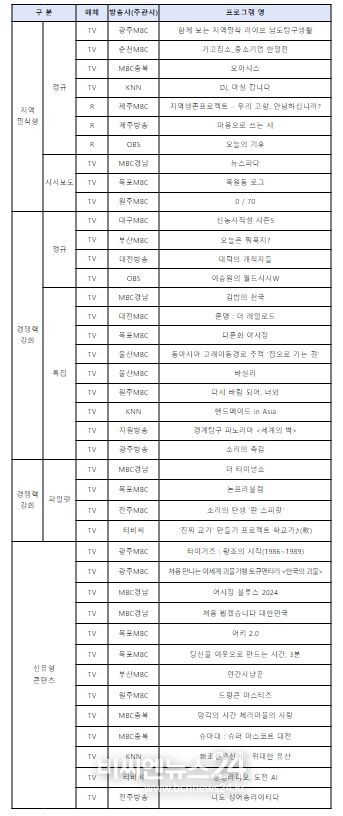 (비씨엔뉴스24) 방송통신위원회는 지역·중소방송의 콘텐츠 경쟁력 강화를 위한 2024년도 프로그램 제작지원 대상작 40편을 선정·발표했다.