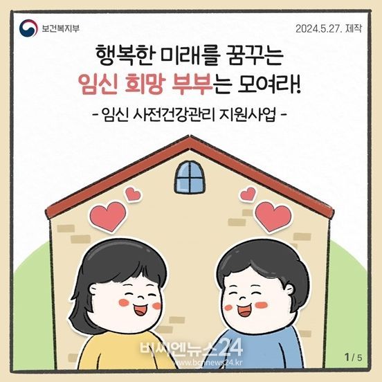 (비씨엔뉴스24) 내 아이와 행복한 미래를 꿈꾸는 임신 희망 부부를 위한 ‘임신 사전건강관리 지원사업’을 소개합니다! 임신 사전건강관리 지원사업 관련 자세한 내용은 카드뉴스를 참고해주세요.