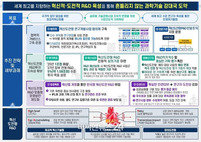 혁신적‧도전적 R&D는 고난이도, 높은 불확실성, 큰 파급효과, 실패가치 인정 등을 특징으로 하여 우리나라 국가 R&D 생태계 전반에 새로운 역동성을 부여하는 「심장(HEART)」과 같은 기능을 수행할 것으로 기대된다.