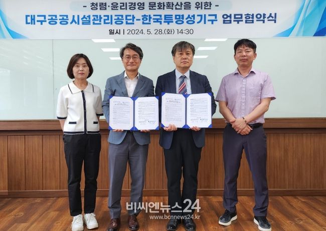 (비씨엔뉴스24) 대구공공시설관리공단이 5월 28일 서부사업소에서 (사)한국투명성기구와 청렴·윤리경영 문화 확산을 위한 업무협약을 체결했다.