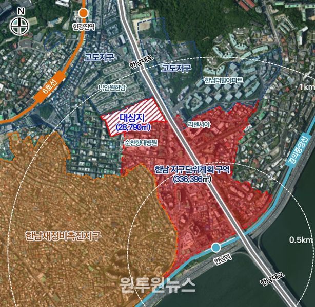 대상지는 20년 이상 도시계획시설(공원)로 지정‧관리되어 왔으나, 예산확보와 토지 보상의 어려움으로 사업이 추진되지 못해 올해 6월 25일 공원 결정이 실효됐다. 이후 해당 부지는 인접한 한남 지구단위계획구역에 추가로 편입됐다.