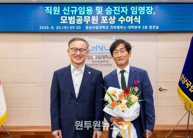 (원투원뉴스) 경상국립대학교 제길수 연구실안전관리팀장이 2025년 상반기 모범공무원으로 선정돼 국무총리 표창을 수상했다. 권진회 총장은 8월 20일 오전 대학본부 접견실에서 모범공무원 정부 포상을 전수했다.