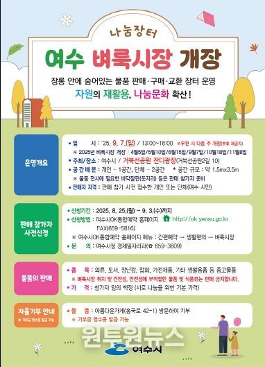 (원투원뉴스) 여수시는 오는 9월 7일 거북선공원에서 2025년 ‘제4회 여수 벼룩시장’을 개최한다.