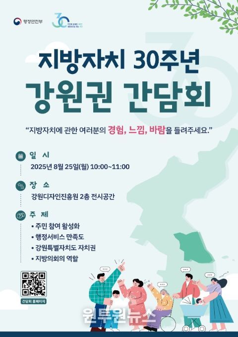 행정안전부와 강원특별자치도는 이번 간담회를 통해 지방자치 현장의 의견을 청취해 민선 지방자치 30년의 성과를 평가하고, 지방자치의 발전을 위한 정책 방향 설계, 제도개선 등에도 의견을 반영할 계획이다.