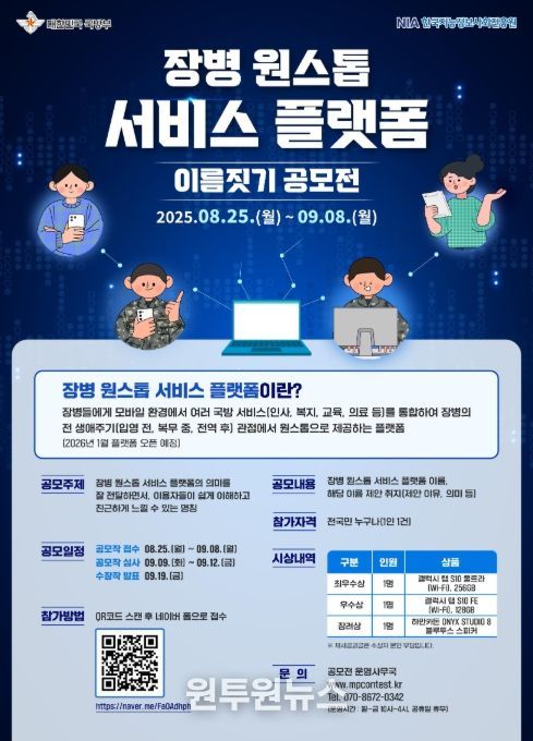 (원투원뉴스) 국방부는 한국지능정보사회진흥원과 함께 오늘부터 9월 8일까지 ‘장병 체감형 원스톱 서비스 플랫폼’ 이름짓기 공모전을 개최한다.