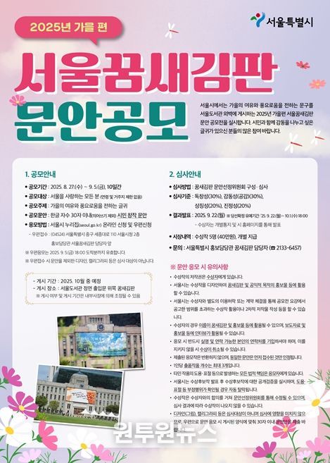 (원투원뉴스) 서울시가 ‘가을의 여유와 풍요로움’을 주제로 한 ‘2025년 가을편 서울 꿈새김판 문안 공모’를 8월 27일부터 9월 5일까지 10일간 진행한다. 서울시 누리집을 통한 온라인 신청과 우편 신청으로 참여할 수 있다.