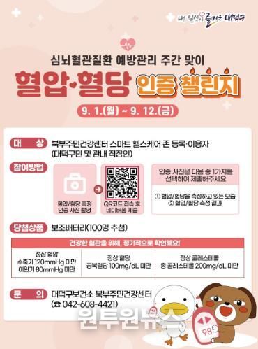 (원투원뉴스) 대전 대덕구가 심뇌혈관질환 예방관리주간(9월 1~7일)을 맞아, 오는 9월 1~12일 ‘혈압·혈당 인증 챌린지’를 운영한다고 28일 밝혔다.