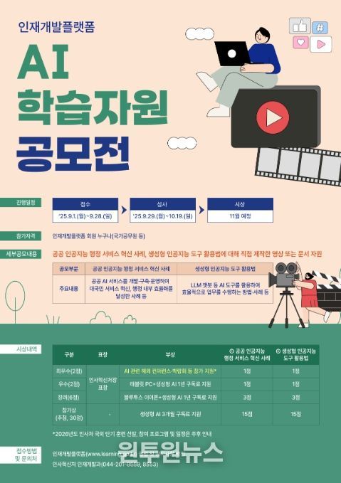 인사혁신처는 공무원의 인공지능 활용 역량을 높이고, 공직 내 학습 문화를 확산하기 위해 ‘인재개발플랫폼 인공지능 학습자원 공모전’을 개최한다고 1일 밝혔다.
