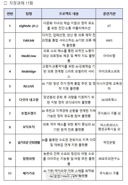 이번 해커톤 참가자들은 모두 노동부의 대표 디지털 훈련사업인 ‘K-디지털 트레이닝’에 참여했다. ‘K-디지털 트레이닝’은 기업 실무에 기반한 프로젝트 중심의 훈련으로 인공지능(IT) 분야 취업을 희망하는 청년들에게 많은 인기를 끌었다. 참가자들은 ‘지역 균형 발전을 위한 디지털 사회서비스 개발’이라는 지정 과제를 두고 프로젝트를 수행하며 그간 훈련을 통해 갈고닦은 기술을 선보일 예정이다.