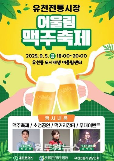 한편, ‘어울림 맥주축제’는 오는 9월 5일 오후 4시 상인회 사무실 개소식을 시작으로 오후 5시 30분부터 본격적인 축제가 열릴 예정이다. 자세한 내용과 참여 방법은 유천전통시장 상인회를 통해 안내받을 수 있다.