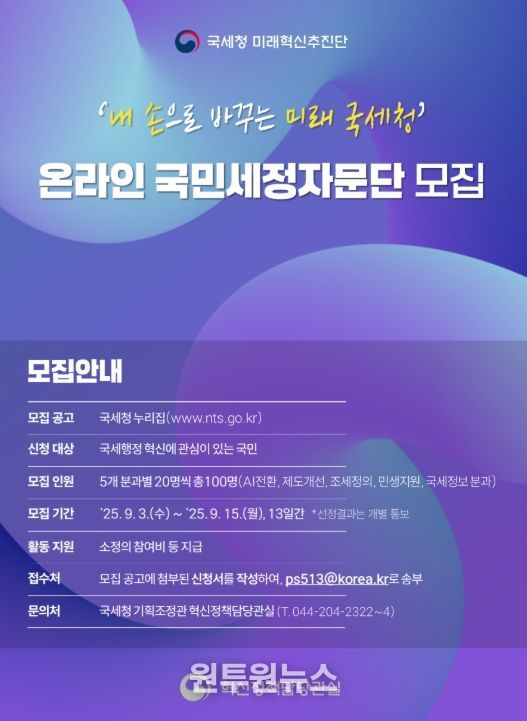 '온라인 국민세정자문단'은 '미래혁신 추진단'의 5개 분과별(AI전환・제도개선・조세정의・민생지원・국세정보) 20명씩, 총 100명을 모집할 계획이며, 일반 납세자의 관점에서 미래 국세행정의 모습을 제안하고, 혁신과제에 대한 현장의 다양한 개선의견을 제공할 예정이다.