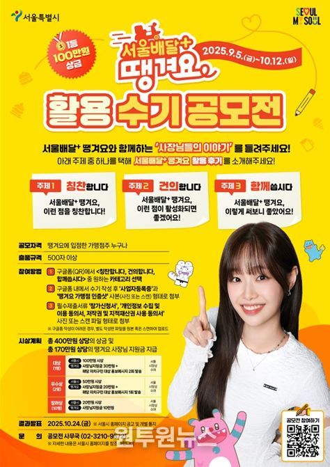 이번 공모전은 오는 9월 5일부터 10월 12일까지 진행되며, ‘서울배달+땡겨요’ 가맹점주라면 누구나 참여할 수 있다. 응모 주제는 ▲칭찬합니다 ▲건의합니다 ▲함께씁시다 등 세 가지로 공공배달앱과 관련된 긍정사례, 개선 제안, 운영 노하우 등을 500자 이상 자유롭게 작성하면 된다.