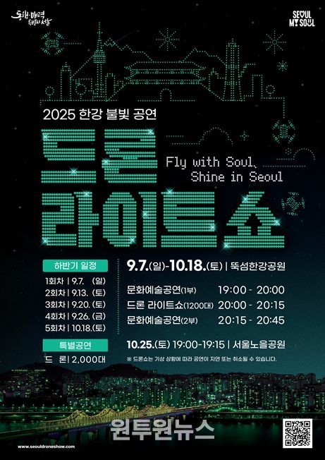 (원투원뉴스) 서울시는 이번 주말 7일 저녁 8시, 뚝섬한강공원에서 전 세계를 K-콘텐츠 열풍으로 이끈 ‘케이팝 데몬 헌터스’를 주제로 한 ‘2025년 한강 불빛 공연(드론 라이트 쇼)’의 화려한 막을 올린다고 밝혔다. 당초 9월 6일 시작 예정이었으나, 우천 예보로 인해 일정을 변경했다.