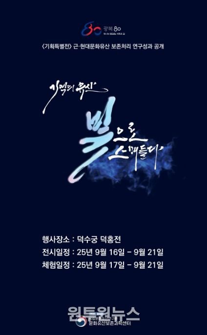 (원투원뉴스) 국가유산청 국립문화유산연구원 문화유산보존과학센터는 광복 80주년을 맞아 오는 9월 16일부터 21일까지 6일간 덕수궁 덕홍전(서울 중구)에서 광복과 독립운동의 상징적 유물이 보존처리를 통해 어떻게 되살아났는지 그 과정을 영상과 사진으로 조명한 기획전 '기억의 유산, 빛으로 스며들다'를 개최하고, 9월 16일 오후 2시에 개막식을 개최한다.