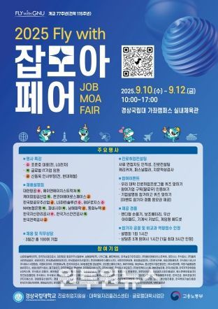 (원투원뉴스) 경상국립대학교는 대학 재학생과 졸업생, 나아가 지역 청년들의 취업을 지원하기 위해 9월 10일부터 12일까지 3일간 가좌캠퍼스 체육관에서 ‘2025학년도 Fly with 잡(Job) 모아 페어(Fair)’를 개최한다.