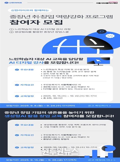 서울시50플러스재단은 신한라이프와 협력해 이번 사업을 공동 추진한다. 중장년이 디지털 전환 시대에 필요한 역량을 키우고, AI를 활용한 취·창업을 지원하는 이번 사업은 느린학습자 교육을 위한 ▲AI활용 디지털 강사 과정과 생성형AI를 활용한 ▲중장년 창업스쿨 등 두 가지 프로그램으로 구성됐다.