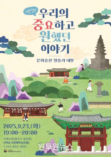 (원투원뉴스) 국가유산청 국립문화유산연구원 국립중원문화유산연구소는 오는 23일 오후 7시 충주 탄금공원 인근에서 ‘우리의 중원(중요하고 원했던) 이야기’ 하반기 시민강좌를 개최한다.