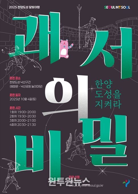 (원투원뉴스) 서울시는 오는 10월 4일 밤, 한양도성 낙산구간에서 ‘한양도성 달빛야행’을 개최한다. 올해 달빛야행은 ‘괘서의 비밀 : 한양도성을 지켜라’를 주제로 몰입형 미션투어로 진행된다. 참가자들은 조선시대 도성수비대가 되어 가짜뉴스의 진상을 파악하고 범인을 추적하는 미션을 수행하게 된다.
