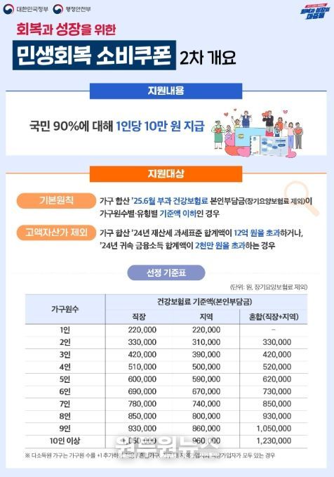 2차 지급 대상은 올해 6월 건강보험료 기준 가구소득 하위 90% 가구다. 가구는 주민등록 세대(6월 18일 기준) 기준으로 하되, 건강보험 피부양자 개념이 적용된다.