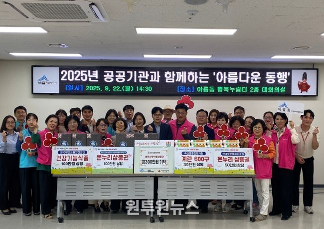 (원투원뉴스) 세종특별자치시 아름동지역사회보장협의체(공동위원장 이인환·조형관)가 22일 아름동 행정복지센터에서 관내 공공기관과 함께 추석맞이 후원 기탁식 ‘아름다운 동행’을 개최했다.