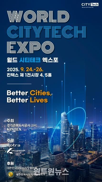 (원투원뉴스) 경기주택도시공사(GH)는 9월 24일부터 26일까지 고양 킨텍스(KINTEX)에서 도시 기술의 미래를 직접 보고 체험할 수 있는 ‘2025 월드 시티테크 엑스포(World CITYTech Expo 2025)’를 개최한다고 23일 밝혔다.