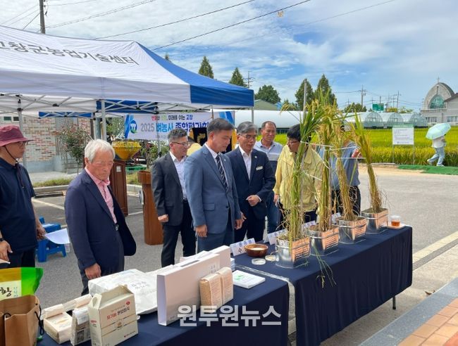 (원투원뉴스) 고창군이 지난 23일 아산면 상갑리 ‘고창쌀 브랜드화 품종비교 전시포’에서 김영식 고창군 부군수, 조민규 고창군의회 의장 등 내빈과 벼 재배농가 등 120여 명이 참석한 가운데 2025년 벼농사 종합평가회를 가졌다.