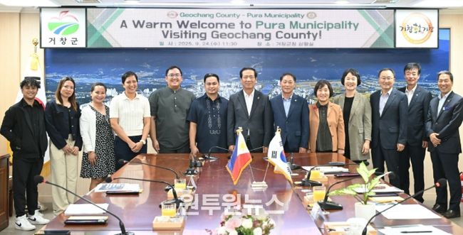 이날 구인모 거창군수와 이재운 거창군의회 의장, 신화범 북부농협 조합장을 비롯한 거창군 관계자들은 거창군청 상황실에서 필리핀 푸라시 대표단의 방문을 환영하고 양 지자체 간의 상생발전 방안을 모색하기 위한 간담회를 가졌다.