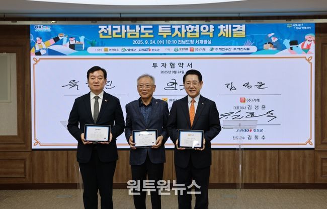 24일 전라남도청에서 전라남도와 영암군이, ㈜해진수산, ㈜해진식품과 투자협약을 체결하고 협력을 약속했다.