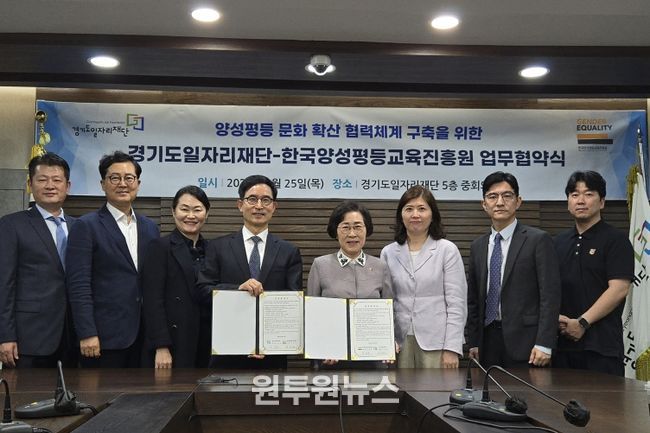 (원투원뉴스) 경기도일자리재단은 25일 수원시에 위치한 남부사업본부에서 한국양성평등교육진흥원과 ‘양성평등 문화 확산과 폭력예방 의식 제고’를 위한 업무협약을 체결했다.